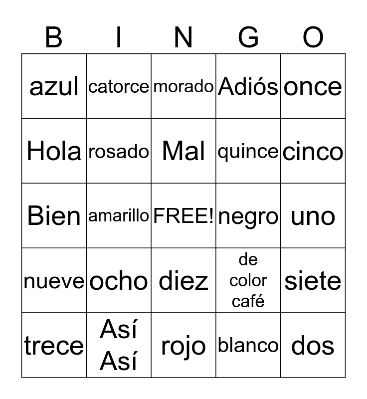 This bingo card has a free space and 31 words: rojo, anaranjado, amarillo, verde, azul, morado, rosado, de color café, negro, blanco, uno, dos, tres, cuatro, cinco, seis, siete, ocho, nueve, diez, once, doce, trece, catorce, quince, Hola, Adiós, Bien, Así Así, Mal and ¿Cómo estás?.