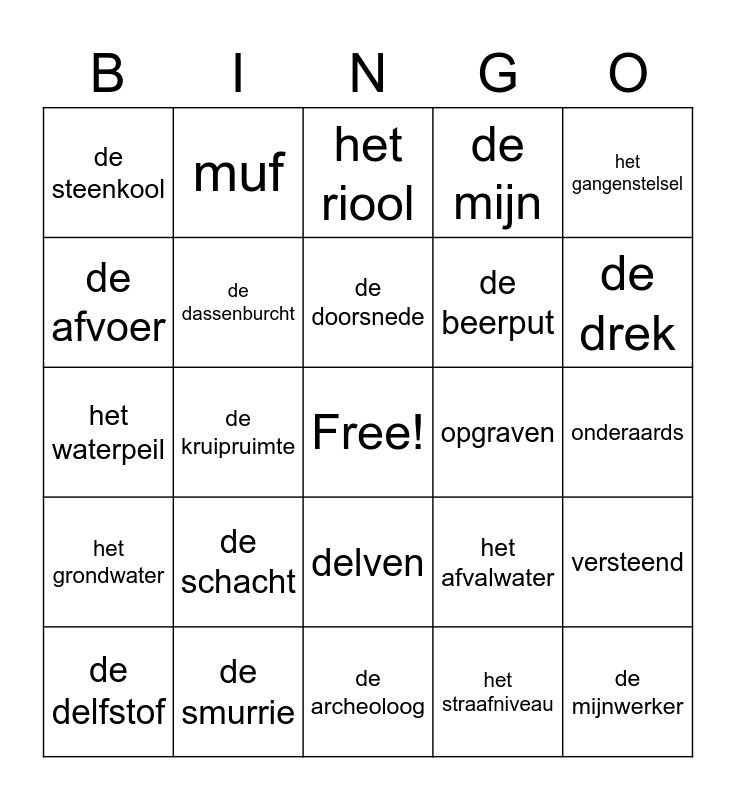 This bingo card has a free space and 39 words: afdalen, de begane grond, de container, de dassenburcht, de delfstof, delven, de doorsnede, het edelmetaal, het gangenstelsel, het grondwater, de kruipruimte, de mijn, de mijnwerker, onderaards, opgraven, de schacht, het soutterrain, de steenkool, de vluchtroute, het afvalwater, de afvoer, de archeoloog, de beerput, de drek, het fossiel, het gewelf, grondig, het hemelwater, lozen, muf, overlopen, overtollig, het riool, de smurrie, het straafniveau, verontreinigd, versteend, het waterpeil and zuiveren.