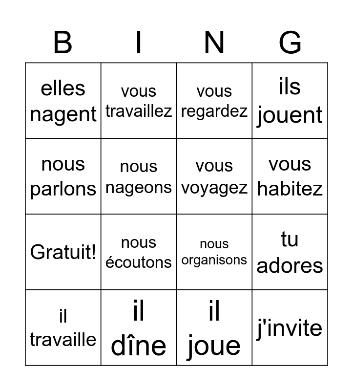 This bingo card has 20 words: tu adores, je nage, vous regardez, tu manges, il travaille, nous parlons, il dîne, elles nagent, Gratuit!, vous travaillez, nous écoutons, nous organisons, nous nageons, j'invite, vous voyagez, ils dînent, vous habitez, ils jouent, il joue and tu chantes.