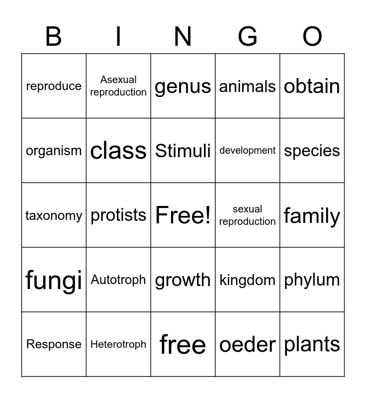 This bingo card has a free space and 24 words: Autotroph, Heterotroph, Stimuli, Response, obtain, reproduce, organism, Asexual reproduction, sexual reproduction, growth, development, taxonomy, kingdom, phylum, class, oeder, family, genus, species, protists, plants, fungi, animals and free.
