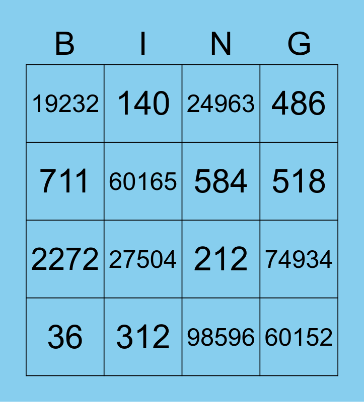 This bingo card has 18 words: 27504, 60152, 24963, 19232, 212, 486, 36, 140, 518, 2272, 98596, 711, 74934, 60165, 584, 5845, 312 and 1795.