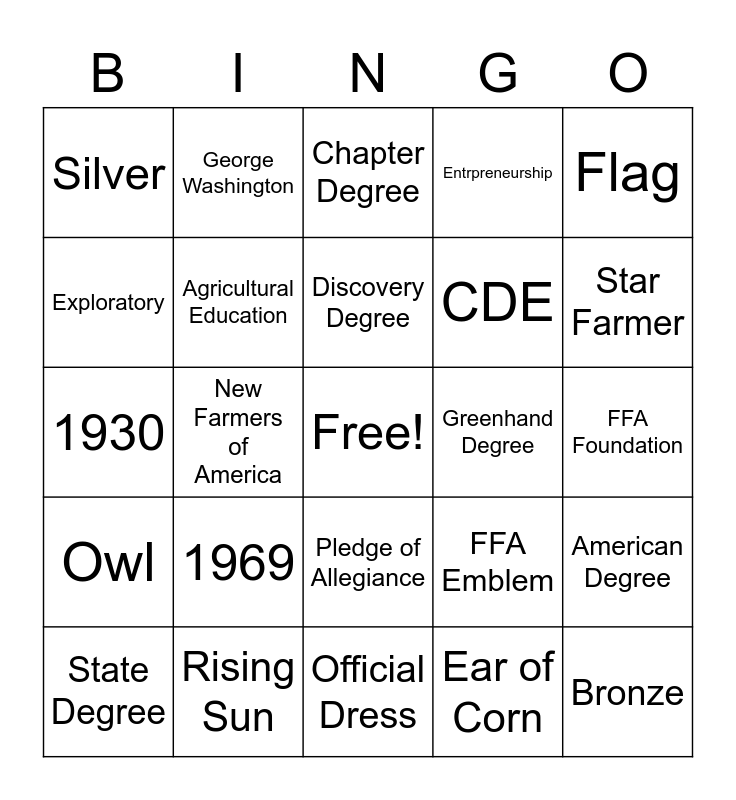 This bingo card has a free space and 59 words: Blue and Gold, Rising Sun, Plow, Owl, Ear of Corn, Eagle, Agricultural Education, Proficiency Award, CDE, SAE, Entrpreneurship, Placement, Exploratory, Research, Gold, Silver, Bronze, Flag, Clasped Hands, Discovery Degree, Greenhand Degree, Chapter Degree, State Degree, American Degree, FFA Creed, E.M. Tiffany, I believe..., Cross section of corn, Star Farmer, Star in AgriScience, Star in Placement, Star in Agribusiness, Virginia, Kansas City, George Washington, National FFA Organization, Girls, New Farmers of America, 1928, 1930, 1955, 1969, FFA Foundation, Indianapolis, Louisville, MN State Fair, U of M Campus, National FFA Week, Pledge of Allegiance, Official Dress, Degree Office Award, FFA Motto, Premier Leadership, Personal Growth, Career Success, FFA Emblem, Region 7, FFA New Horizons and Future Farmers of America.