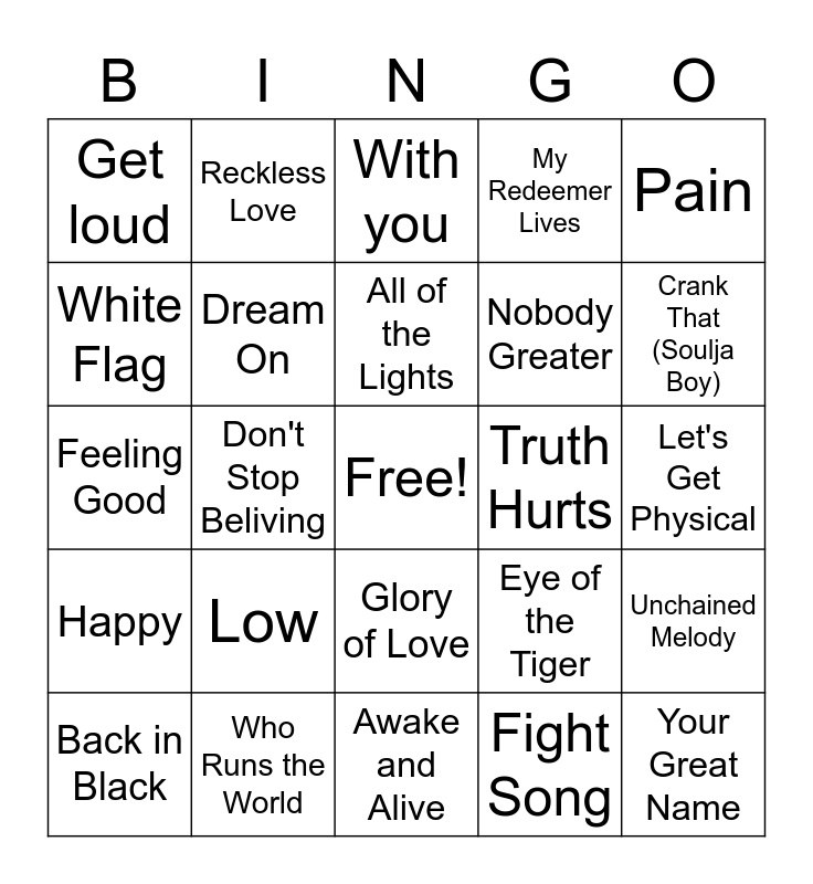 This bingo card has a free space and 128 words: Golden, Reckless Love, I can't go for that, A Change Gonna Come, I Hope You Dance, You're the Inspiration, Happy, Keep On Pushing, Dont Stop Believing, let's go crazy, Ain't No Mountain High Enough, Fight Song, one step at a time, Nessun dorma, It Is Well With My Soul, Isn't She Lovely, Awake and Alive, Don't Stop, Celebration, Don't Stop Believing, Get Up Offa That Thing, Nobody Greater, Don’t stop believing, Here Comes the Sun, Nothing but Praise, A Little Less Conversation (JXL radio Edit Remix), Your Great Name, See you again, Do You Realize?, Dancing Queen, Feeling Good, Don't Stop Beliving, Ego (remix), Me, I Will Survive, Here Comes the Sun, Stand, Ain't No Mountain High Enough, Hold On, I Can Only Imagine, Truth Hurts, I Can Only Imagine, Here Comes the Sun, Lose Control, Til The Day I Die, Diamonds, X Gon Give It To You, Low, Magnum P. I., Eye of the Tiger, Whatever It Takes, Back in Black, groove is in the heart, Anything by Chaka Kahn!, I Gotta Feeling, Forever, Map of the Problematique, Circus, Never Gonna Give You Up, Love Shack, Ballroom Blitz, Born in the USA, Maniac (Flash Dance), Just Dance, Love My Life, Get loud, All I Do Is Win, Take Me to the King, Crank That (Soulja Boy), White Flag, Don't stop the music, Let's Get Physical, Celebration, I'm Gonna Do My Thing, Pump up the Jam, B.O.B., He's Able, Eye of the Tiger, ABC, Best Day of my Life, Fight Song, Pain, Let's Get Physical, Sexyback, All of the Lights, Hey Ya!, Who Runs the World, I Will Always Love You, Can You Stand the Rain, We are family, The Dance, We Are the Champions, Glory of Love, We are the Champions, how can you mend a broken heart, Don't Stop Believing, It's All Coming Back to Me Now, With you, Dream On, Beethoven's 9th Symphony, My Redeemer Lives, Try Jah Love, Purple Rain, We are the Champions, Unchained Melody, More Than Words, Halo, Bohemian rhapsody, In Your Eyes, Dance with My Father, Every Rose Has Its Thorn, So What, It must have been Love, It's Not My Place, Sweet Home Alabama, The Story, Bohemian Rapsody, (Tie) I Need Love | Beth, Change Going to Come, Girl on Fire, I Will Always Love You, Open Arms, Never Enough, Long Time, I would Do Anything for Love, Believer, Faithfully and Total Eclipse of the Heart.