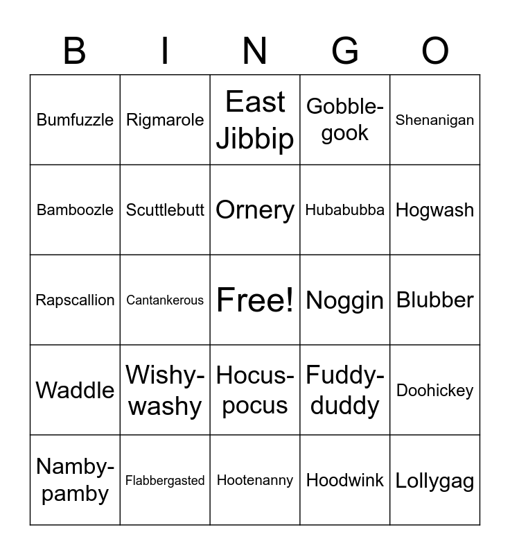 This bingo card has a free space and 24 words: Wishy-washy, Flabbergasted, Ornery, Namby-pamby, Shenanigan, Bumfuzzle, Bamboozle, Rigmarole, Noggin, Hocus-pocus, Hubabubba, Rapscallion, Fuddy-duddy, Doohickey, Scuttlebutt, Hoodwink, Blubber, East Jibbip, Hogwash, Cantankerous, Lollygag, Waddle, Gobble-gook and Hootenanny.