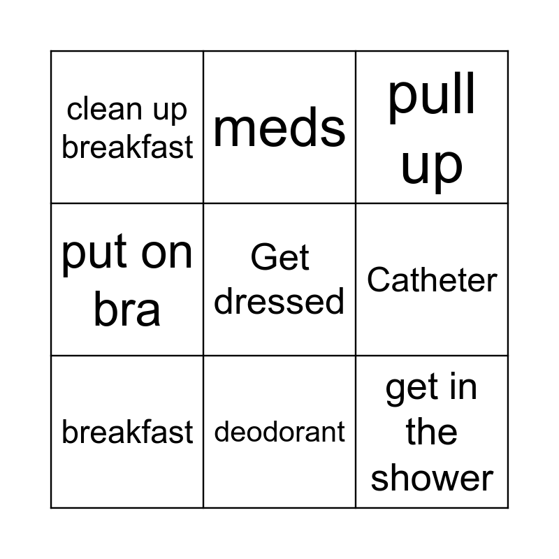 This bingo card has a free space and 8 words: Catheter, pull up, meds, breakfast, clean up breakfast, get in the shower, put on bra and deodorant.