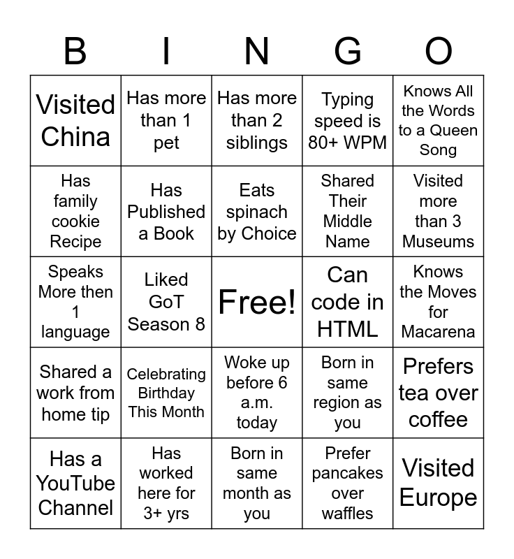 This bingo card has a free space and 24 words: Celebrating Birthday This Month, Has worked here for 3+ yrs, Eats spinach by Choice, Has a YouTube Channel, Knows All the Words to a Queen Song, Visited China, Has family cookie Recipe, Has more than 1 pet, Can code in HTML, Woke up before 6 a.m. today, Shared Their Middle Name, Speaks More then 1 language, Born in same region as you, Prefers tea over coffee, Has Published a Book, Prefer pancakes over waffles, Knows the Moves for Macarena, Has more than 2 siblings, Visited more than 3 Museums, Liked GoT Season 8, Visited Europe, Shared a work from home tip, Typing speed is 80+ WPM and Born in same month as you.