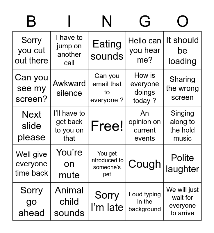 This bingo card has a free space and 24 words: You’re on mute, Animal child sounds, Can you email that to everyone ?, Sorry go ahead, It should be loading, Sorry you cut out there, Can you see my screen?, I have to jump on another call, An opinion on current events, You get introduced to someone’s pet, How is everyone doings today ?, Next slide please, Cough, Polite laughter, Awkward silence, Loud typing in the background, Singing along to the hold music, Eating sounds, Sharing the wrong screen, I’ll have to get back to you on that, We will just wait for everyone to arrive, Well give everyone time back, Hello can you hear me? and Sorry I’m late.