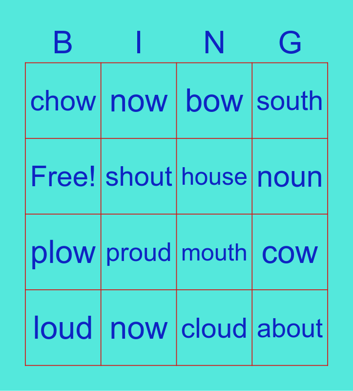 This bingo card has 16 words: now, cow, bow, chow, plow, now, mouth, cloud, Free!, shout, loud, south, proud, noun, house and about.