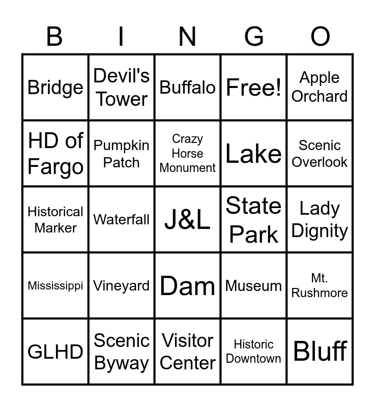 This bingo card has a free space and 29 words: GLHD, Weeping Willow, Waterfall, Corn Maze, Bridge, Buffalo, Pumpkin Patch, Vineyard, State Park, Scenic Byway, Lady Dignity, Bluff, Visitor Center, Historic Downtown, Scenic Overlook, Veteran's Memorial, Dam, Mississippi, Apple Orchard, Historical Marker, Museum, Pheasant, Lake, HD of Fargo, Free!, Devil's Tower, Mt. Rushmore, Crazy Horse Monument and Sylvan Lake.