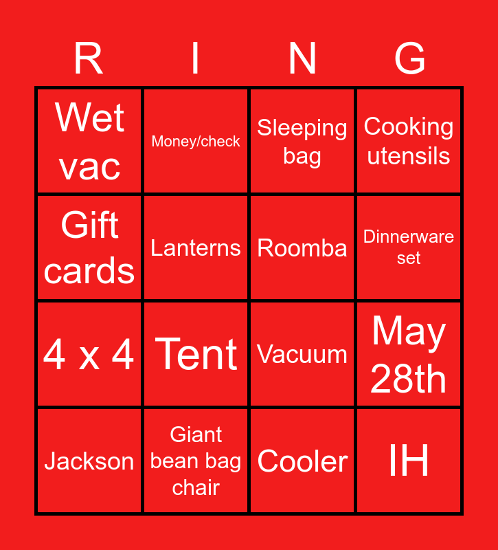 This bingo card has 26 words: Bedding set, Curtains, Vacuum, Knife set, Gift cards, Money/check, Roomba, Cooking utensils, Deep fryer, Tent, Cooler, Dinnerware set, Pots and pans, Giant bean bag chair, Towels, Industrial cleaning set, Wet vac, Lanterns, Sleeping bag, May 28th, Jackson, Cooley, Nightmare Before Christmas, IH, 4 x 4 and June 3rd.