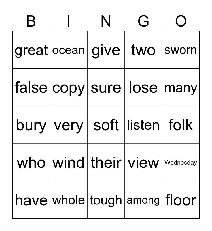 This bingo card has 115 words: one, only, of, from, to, too, two, four, do, don't, gone, were, what, where, there, they, their, are, you, your, have, give, live, also, mother, who, whole, could, would, any, many, sure, very, owe, own, such, much, which, father, woman, women, buy, build, half, pint, triple, among, false, move, against, often, listen, push, pull, bush, door, floor, friend, pretty, laugh, Wednesday, February, minute, sew, because, study, city, copy, bury, yolk, folk, eye, stomach, toward, answer, soft, wind, great, steak, straight, walk, ocean, island, view, lose, bear, pear, tear, wear, toward, shoe, sugar, wore, swore, sworn, honest, honor, blood, flood, truth, doubt, debt, guess, guest, guy, guard, calf, wolf, tough, cough, enough, journey, route, machine and sign.