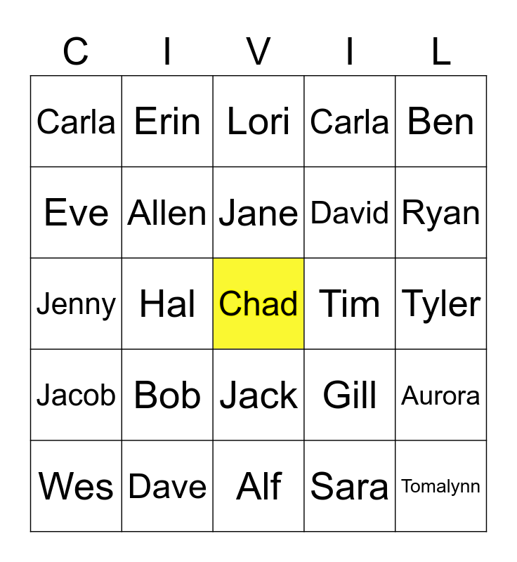 This bingo card has a free space and 24 words: Bob, Dave, Jane, Wes, Ben, Carla, Eve, Erin, Tim, Jack, David, Jenny, Gill, Aurora, Allen, Sara, Tyler, Lori, Ryan, Hal, Tomalynn, Jacob, Carla and Alf.