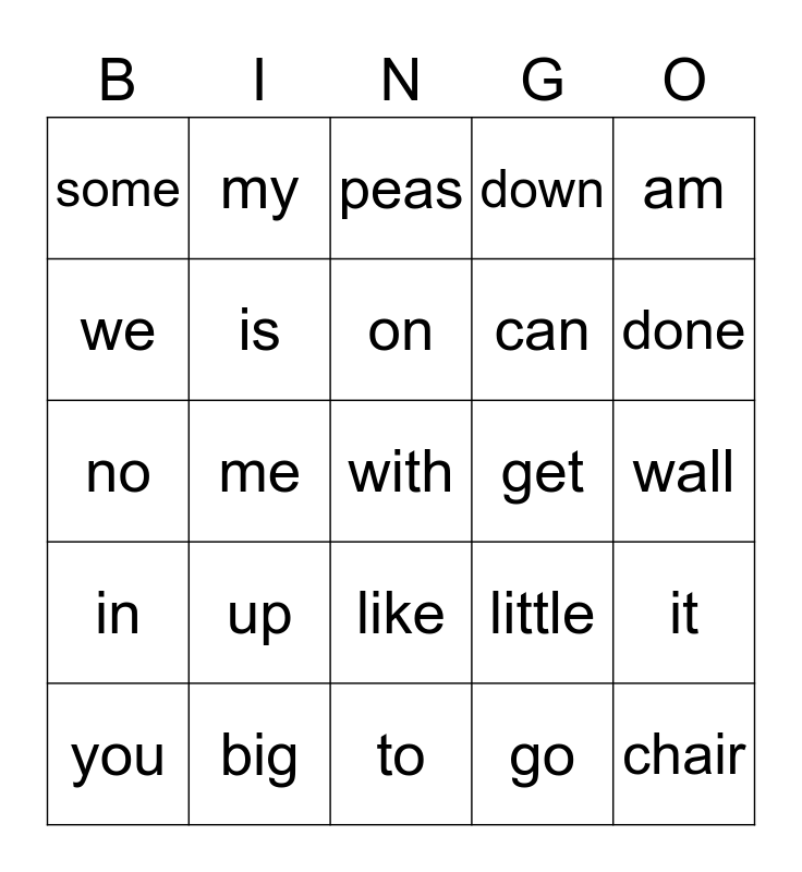 This bingo card has a free space and 36 words: the, he, she, is, little, in, on, look, am, see, me, down, come, get, done, some, said, up, chair, peas, wall, it, big, you, to, my, no, at, can, we, and, an, go, like, are and have.