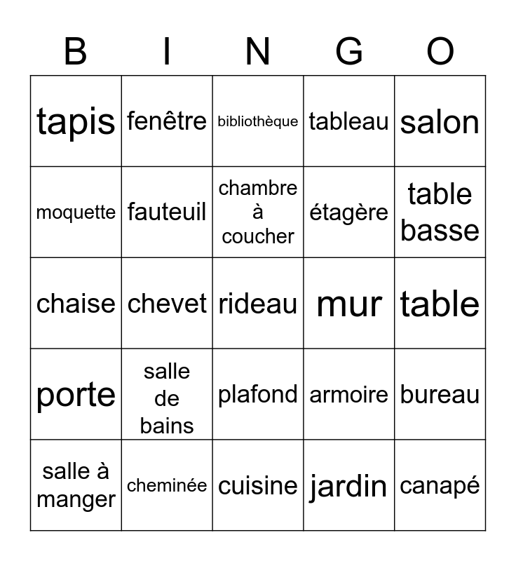 This bingo card has 25 words: salle de bains, cuisine, chambre à coucher, salle à manger, salon, tapis, moquette, fenêtre, mur, plafond, étagère, chaise, armoire, bureau, fauteuil, canapé, table, bibliothèque, table basse, chevet, rideau, cheminée, porte, tableau and jardin.