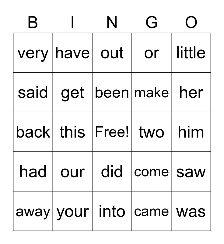 This bingo card has a free space and 24 words: our, your, been, away, little, very, said, have, two, did, make, back, come, saw, get, came, him, out, her, this, was, had, or and into.