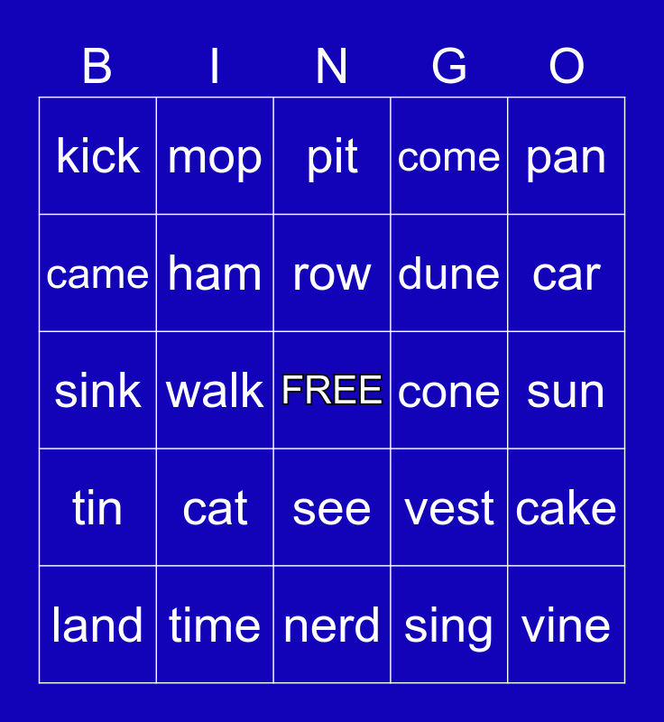 This bingo card has a free space and 24 words: cat, time, row, land, pan, kick, came, mop, cone, see, dune, sink, vest, cake, ham, sing, sun, pit, car, walk, vine, tin, come and nerd.