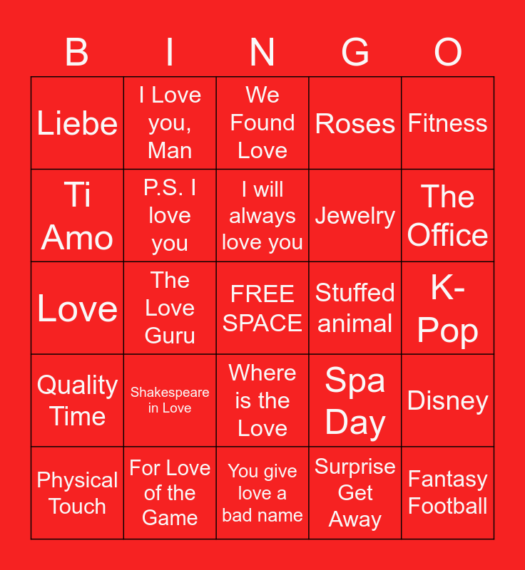 This bingo card has a free space and 66 words: Amore, Love Actually, What's Love got to do with it, Box of Chocolate, Talking to their dogs, Je t'aime, I Love you, Man, Love yourself, Stuffed animal, Air Pods, Ti Amo, Eat, Pray, Love, Pajamas, The Office, Pag-ibig, P.S. I love you, I will always love you, Roses, Avacado Toast, Liebe, Shakespeare in Love, You give love a bad name, Jewelry, Particular coffee orders, Amor, Crazy, Stupid, Love, Crazy little thing called love, Gift Card, K-Pop, Cinta, For Love of the Game, I love Rock N Rock, Massage, Morning Routines, Love, The Love Bug, Whole Lotta Love, Spa Day, Disney, Gifts, The Love Guru, Where is the Love, Surprise Get Away, Game of Thrones, Words of Affirmation, Punch Drunk Love, We Found Love, A RING, Fantasy Football, Physical Touch, Doctor Strange Love, Summer Lovin', Hand written card, Coffee, Acts Of Service, Love At First Bite, Can You Feel The Love Tonight, Picture Framed, Fitness, Quality Time, Can't Buy Me Love, Love Tender, Bottle of Wine, podcasts, Why do fools fall in love and You can't hurry Love.