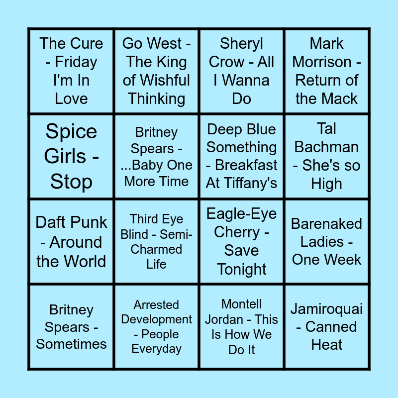 This bingo card has 59 words: Free!, Backstreet Boys - I Want It That Way, Natalie Imbruglia - Torn, Jamiroquai - Canned Heat, Oasis - Wonderwall, OMC - How Bizarre, Deep Blue Something - Breakfast At Tiffany's, Fatboy Slim - Praise You, Daft Punk - Around the World, Mariah Carey - Fantasy, Mark Morrison - Return of the Mack, Cher - The Shoop Shoop Song (It's In His Kiss), Britney Spears - ...Baby One More Time, A Tribe Called Quest - Can I Kick It?, Hanson - MMMBop, The Cure - Friday I'm In Love, Britney Spears - Sometimes, Spice Girls - Stop, Smash Mouth - Walkin' On The Sun, Tal Bachman - She's so High, Arrested Development - People Everyday, Sheryl Crow - All I Wanna Do, Shania Twain - Man! I Feel Like A Woman!, Robin S - Show Me Love, Ms. Lauryn Hill - Doo Wop (That Thing), Will Smith - Gettin' Jiggy Wit It, Oasis - Champagne Supernova, Peter Andre - Mysterious Girl, Third Eye Blind - Semi-Charmed Life, Cher - Believe, Hanson - MMMBop, Smash Mouth - All Star, CeCe Peniston - Finally, The Smashing Pumpkins - 1979, Go West - The King of Wishful Thinking, Faith Hill - This Kiss, No Doubt - Just A Girl, Barenaked Ladies - One Week, Christina Aguilera - Come on over Baby, Eagle-Eye Cherry - Save Tonight, Des'ree - You Gotta Be, Macy Gray - I Try, Montell Jordan - This Is How We Do It, Wilson Phillips - Hold On, Ace of Base - The Sign, Jennifer Paige - Crush, Corona - The Rhythm of the Night, Jennifer Lopez - Waiting for Tonight, Sixpence None The Richer - Kiss Me, Vengaboys - Boom, Boom, Boom, Boom!!, Chumbawamba - Tubthumping, Alice DJ - Better Off Alone, Beastie Boys - Intergalactic, Faith No More - Easy, TLC - Waterfalls, Salt-N-Pepa - Shoop, The Notorious B.I.G. - Juicy, Warren G - Regulate and Wheatus - Teenage Dirtbag.