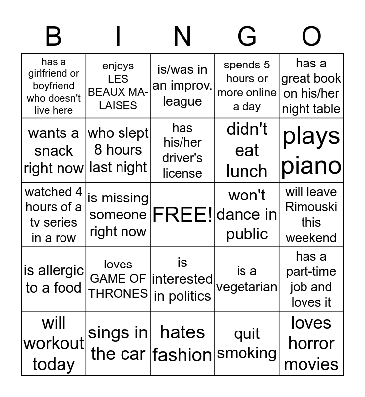 This bingo card has a free space and 24 words: loves GAME OF THRONES, sings in the car, has his/her driver's license, will workout today, has a great book on his/her night table, has a girlfriend or boyfriend who doesn't live here, wants a snack right now, enjoys LES BEAUX MA-LAISES, won't dance in public, is interested in politics, didn't eat lunch, watched 4 hours of a tv series in a row, is a vegetarian, has a part-time job and loves it, who slept 8 hours last night, quit smoking, will leave Rimouski this weekend, is/was in an improv. league, plays piano, is missing someone right now, loves horror movies, is allergic to a food, spends 5 hours or more online a day and hates fashion.