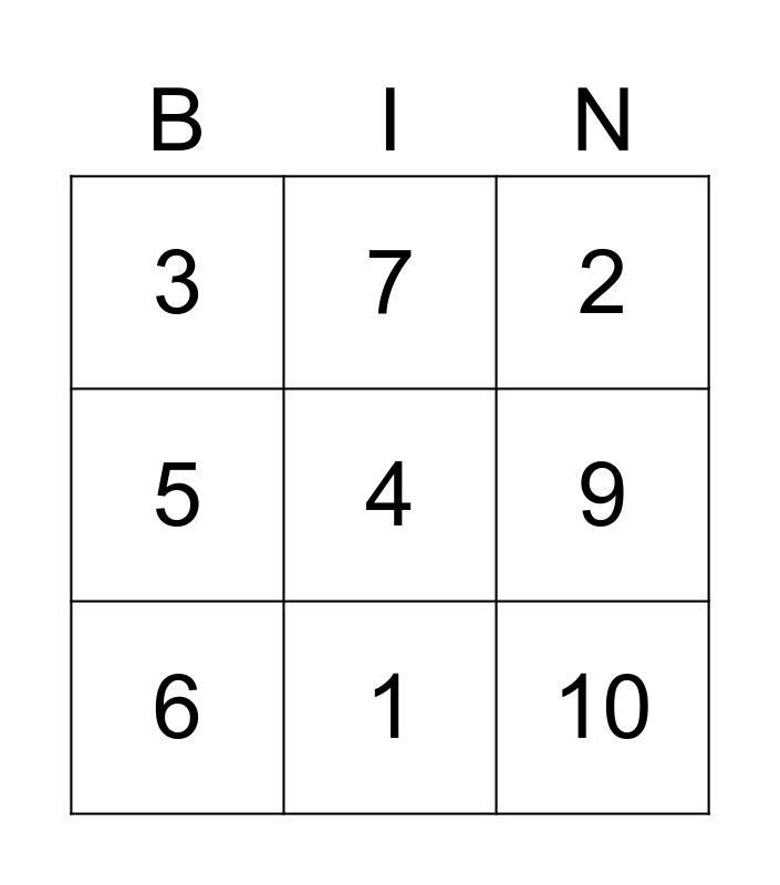 This bingo card has 10 words: 1, 2, 3, 4, 5, 6, 7, 8, 9 and 10.
