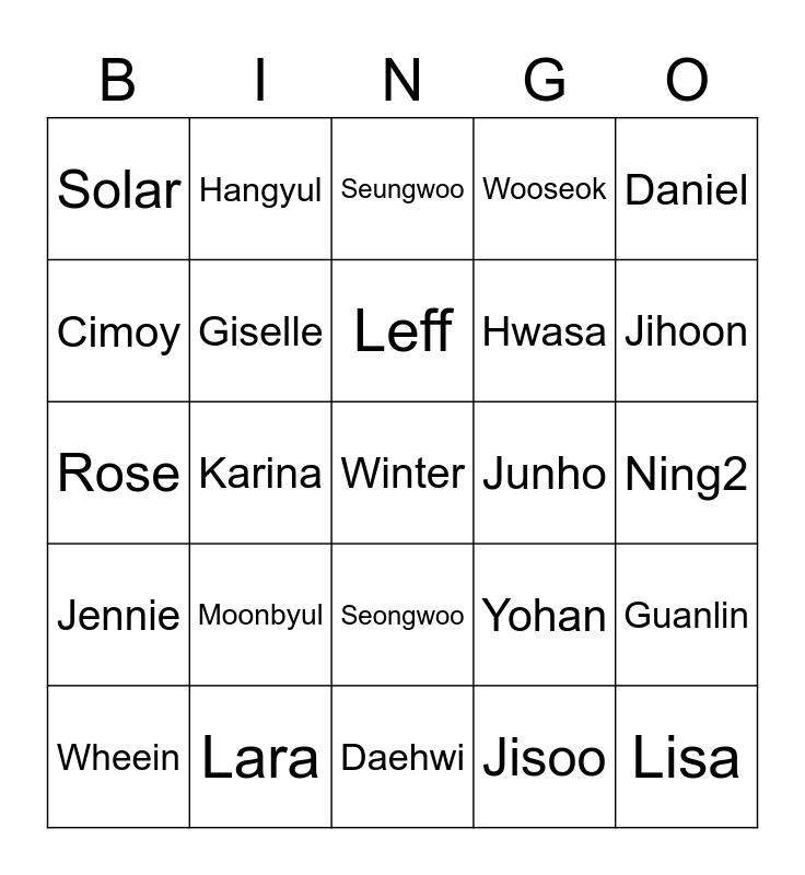 This bingo card has a free space and 24 words: Moonbyul, Lara, Leff, Wheein, Daniel, Solar, Cimoy, Hangyul, Junho, Seongwoo, Hwasa, Rose, Yohan, Guanlin, Giselle, Jisoo, Ning2, Seungwoo, Jihoon, Karina, Lisa, Jennie, Wooseok and Daehwi.