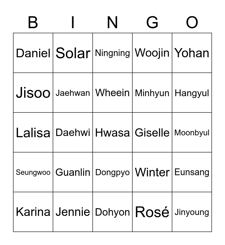 This bingo card has a free space and 24 words: Guanlin, Jennie, Wheein, Karina, Yohan, Daniel, Jisoo, Solar, Giselle, Dongpyo, Minhyun, Lalisa, Winter, Eunsang, Jaehwan, Rosé, Moonbyul, Ningning, Hangyul, Daehwi, Jinyoung, Seungwoo, Woojin and Dohyon.