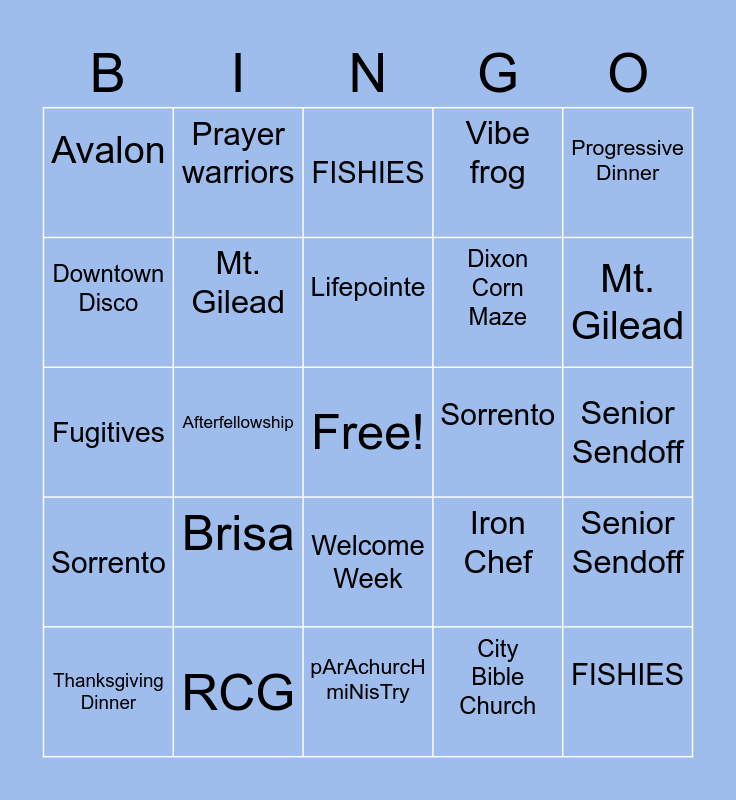 This bingo card has a free space and 51 words: Large group, FISHIES, Hunt 100, pArAchurcH miNisTry, Brisa, Small group, Prayer warriors, RCG, Downtown Disco, Boba/Bingsoo, Mt. Gilead, Vibe frog, Senior Sendoff, Iron Chef, Winter Retreat, Closing Grid (Circle), Lifepointe, Sorrento, Fugitives, Progressive Dinner, Afterfellowship, City Bible Church, Avalon, Dixon Corn Maze, Large group, Small group, Mt. Gilead, Winter Retreat, Thanksgiving Dinner, FISHIES, Prayer warriors, Vibe frog, Closing Grid (Circle), Afterfellowship, Hunt 100, RCG, Lifepointe, City Bible Church, pArAchurcH miNisTry, Downtown Disco, Senior Sendoff, Sorrento, Avalon, Brisa, McDonalds, Iron Chef, Fugitives, Dixon Corn Maze, Progressive Dinner, Welcome Week and Boba/Bingsoo.