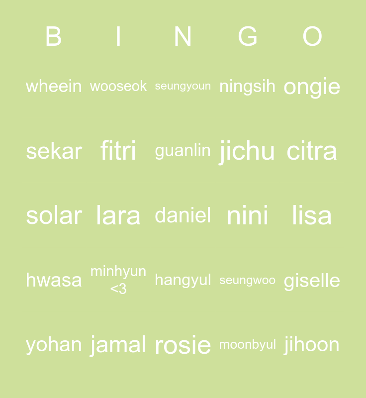 This bingo card has a free space and 24 words: minhyun <3, jamal, guanlin, yohan, ongie, wheein, sekar, wooseok, nini, hangyul, jichu, solar, seungwoo, giselle, fitri, moonbyul, lisa, seungyoun, citra, lara, jihoon, hwasa, ningsih and rosie.