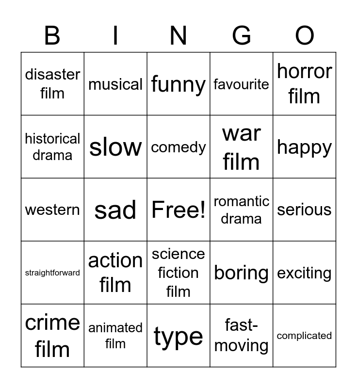 This bingo card has a free space and 24 words: action film, animated film, comedy, crime film, horror film, disaster film, historical drama, musical, romantic drama, science fiction film, war film, western, boring, exciting, slow, fast-moving, serious, funny, happy, sad, complicated, straightforward, favourite and type.