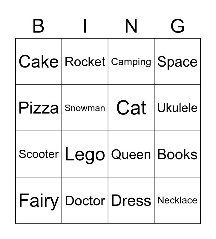 This bingo card has 30 words: Alexis, Bike, Books, Butterfly, Cake, Camping, Cat, Crafts, Doctor, Drawing, Dress, Fairy, Football, Friends, Lego, Maddie, Magic, Necklace, Orange, Pizza, Queen, Rainbow, Rocket, Scooter, Snowman, Space, Stick, Troll, Ukulele and Wellies.