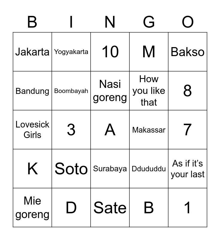 This bingo card has 25 words: Soto, Sate, Nasi goreng, Mie goreng, Bakso, Jakarta, Bandung, Yogyakarta, Makassar, Surabaya, How you like that, Lovesick Girls, Ddududdu, As if itβs your last, Boombayah, 1, 7, 10, 8, 3, A, D, K, M and B.