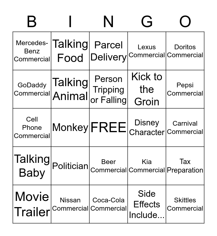 This bingo card has a free space and 24 words: Politician, Nissan Commercial, Person Tripping or Falling, Movie Trailer, Doritos Commercial, Mercedes-Benz Commercial, GoDaddy Commercial, Talking Food, Disney Character, Beer Commercial, Kick to the Groin, Cell Phone Commercial, Kia Commercial, Tax Preparation, Talking Animal, Side Effects Include..., Carnival Commercial, Parcel Delivery, Pepsi Commercial, Monkey, Skittles Commercial, Talking Baby, Lexus Commercial and Coca-Cola Commercial.