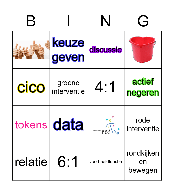 This bingo card has 3 images and 13 words: 6:1, rode interventie, discussie, tokens, keuze geven, voorbeeldfunctie, cico, groene interventie, relatie, data, actief negeren, 4:1 and rondkijken en bewegen.