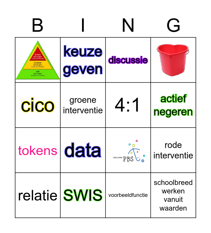 This bingo card has 3 images and 13 words: SWIS, rode interventie, discussie, tokens, keuze geven, voorbeeldfunctie, cico, groene interventie, relatie, data, actief negeren, 4:1 and schoolbreed werken vanuit waarden.