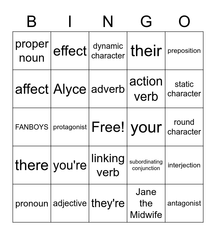 This bingo card has a free space and 24 words: you're, adjective, adverb, pronoun, preposition, proper noun, affect, effect, your, linking verb, action verb, FANBOYS, subordinating conjunction, interjection, Alyce, Jane the Midwife, round character, dynamic character, static character, protagonist, antagonist, there, their and they're.