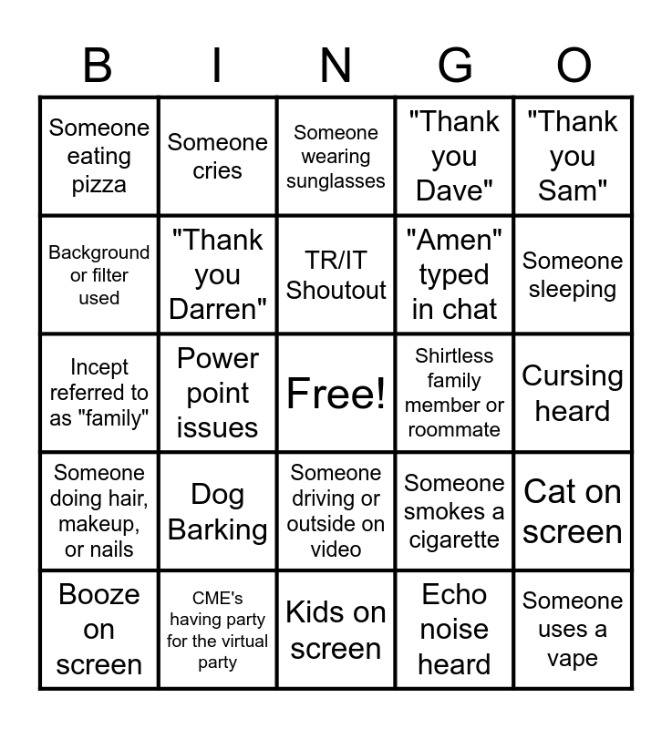 This bingo card has a free space and 24 words: Dog Barking, CME's having party for the virtual party, TR/IT Shoutout, Booze on screen, "Thank you Sam", Someone eating pizza, Background or filter used, Someone cries, Shirtless family member or roommate, Someone driving or outside on video, "Amen" typed in chat, Incept referred to as "family", Someone smokes a cigarette, Cat on screen, "Thank you Darren", Echo noise heard, Cursing heard, Someone wearing sunglasses, Someone sleeping, Power point issues, Someone uses a vape, Someone doing hair, makeup, or nails, "Thank you Dave" and Kids on screen.