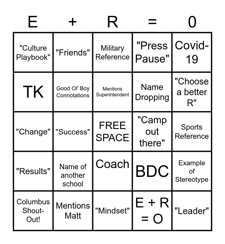 This bingo card has a free space and 24 words: Name of another school, Mentions Matt, Mentions Superintendent, Columbus Shout-Out!, Covid-19, "Culture Playbook", TK, "Friends", "Camp out there", Coach, Name Dropping, "Change", BDC, Example of Stereotype, Good Ol' Boy Connotations, E + R = O, Sports Reference, Military Reference, "Choose a better R", "Success", "Leader", "Results", "Press Pause" and "Mindset".