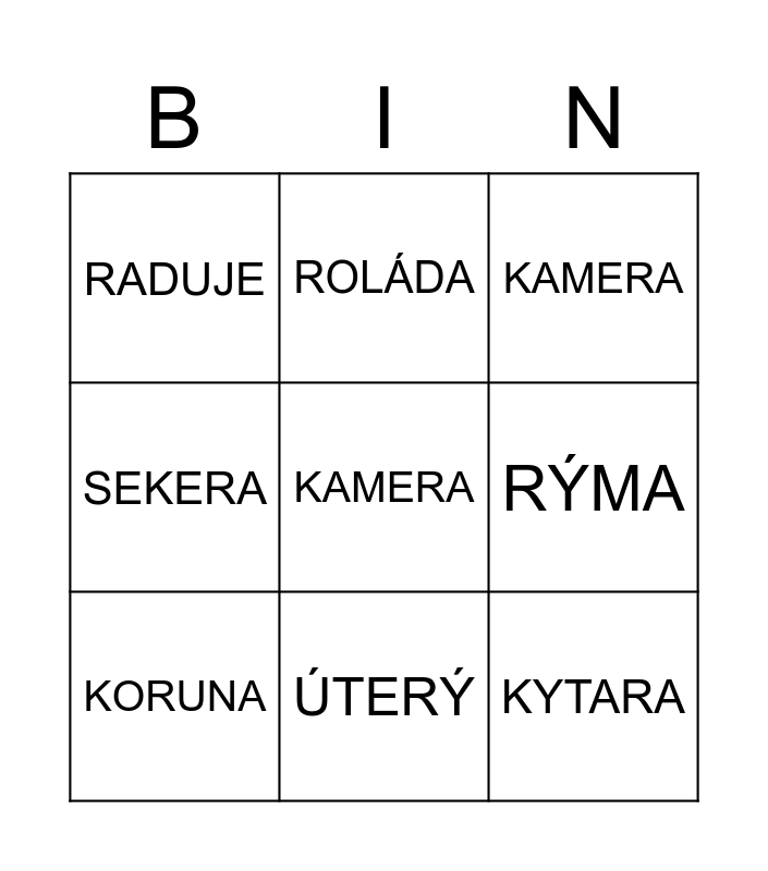 This bingo card has a free space and 14 words: ROLETA, RAKETA, KORUNA, ROLÁDA, SEKERA, KYTARA, DARUJE, KORÁLE, ÚTERÝ, RADUJE, DÁREK, RÝMA, KAMERA and PÁREK.