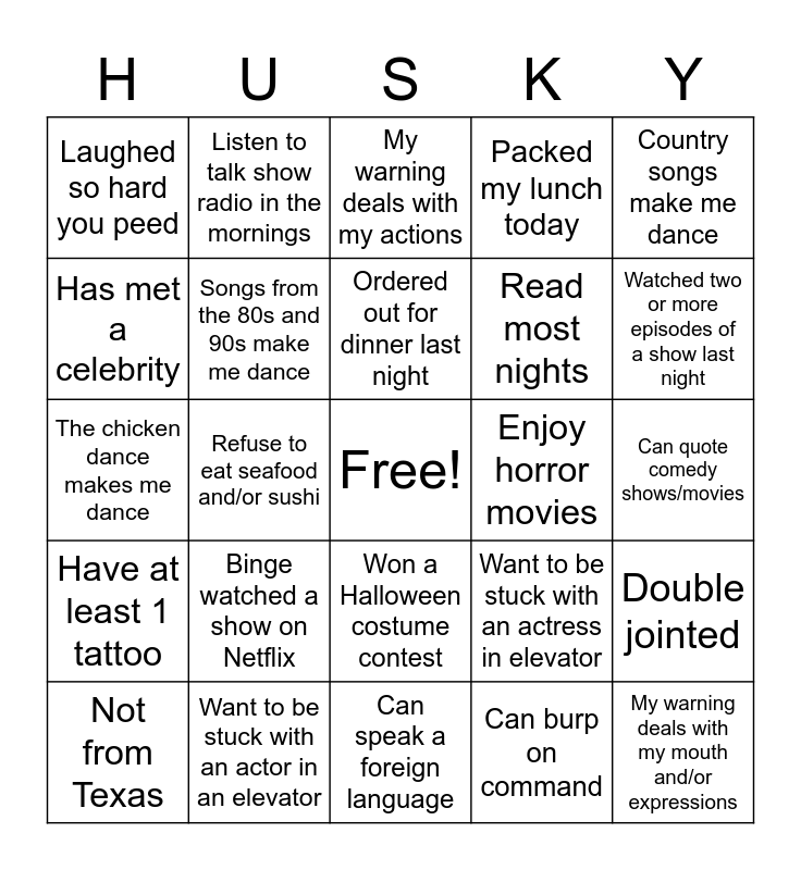 This bingo card has a free space and 24 words: Binge watched a show on Netflix, Want to be stuck with an actor in an elevator, Ordered out for dinner last night, Not from Texas, Country songs make me dance, Laughed so hard you peed, Has met a celebrity, Listen to talk show radio in the mornings, Enjoy horror movies, Won a Halloween costume contest, Read most nights, The chicken dance makes me dance, Want to be stuck with an actress in elevator, Double jointed, Songs from the 80s and 90s make me dance, Can burp on command, Can quote comedy shows/movies, My warning deals with my actions, Watched two or more episodes of a show last night, Refuse to eat seafood and/or sushi, My warning deals with my mouth and/or expressions, Have at least 1 tattoo, Packed my lunch today and Can speak a foreign language.