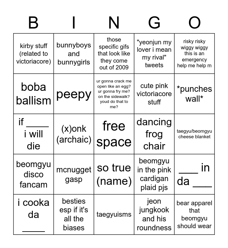 This bingo card has a free space and 24 words: mcnugget gasp, besties esp if it's all the biases, ur gonna crack me open like an egg? ur gonna fry me? on the sidewalk? youd do that to me?, i cooka da ____, risky risky wiggy wiggy this is an emergency help me help m, kirby stuff (related to victoriacore), boba ballism, bunnyboys and bunnygirls, dancing frog chair, so true (name), cute pink victoriacore stuff, if ____ i will die, beomgyu in the pink cardigan plaid pjs, ___ in da ___, peepy, jeon jungkook and his roundness, taegyu/beomgyu cheese blanket, those specific gifs that look like they come out of 2009, *punches wall*, (x)onk (archaic), bear apparel that beomgyu should wear, beomgyu disco fancam, "yeonjun my lover i mean my rival" tweets and taegyuisms.