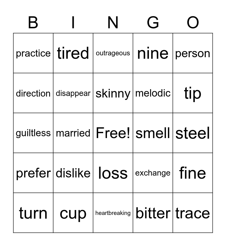 This bingo card has a free space and 50 words: plan, trace, lumpy, heartbreaking, dislike, phone, tired, army, direction, hurt, disappear, nine, fine, exchange, activity, spiky, skinny, smell, hum, person, married, bitter, practice, melodic, church, better, tip, test, outrageous, loss, stone, courageous, border, stop, cup, weary, wrong, silk, slap, steel, wonderful, frame, bikes, wakeful, turn, guiltless, medical, inquisitive, prefer and wacky.