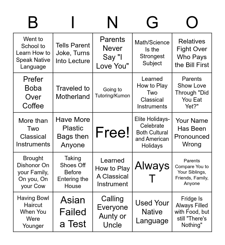 This bingo card has a free space and 25 words: Taking Shoes Off Before Entering the House, Calling Everyone Aunty or Uncle, Going to Tutoring/Kumon, Having Bowl Haircut When You Were Younger, Relatives Fight Over Who Pays the Bill First, Went to School to Learn How to Speak Native Language, Prefer Boba Over Coffee, Tells Parent Joke, Turns Into Lecture, Elite Holidays-Celebrate Both Cultural and American Holidays, Learned How to Play A Classical Instrument, Learned How to Play Two Classical Instruments, More than Two Classical Instruments, Always T, Parents Compare You to Your Siblings, Friends, Family, Anyone, Traveled to Motherland, Assumed Someone was Related to You Because of Your Last Name, Your Name Has Been Pronounced Wrong, Parents Never Say "I Love You", Parents Show Love Through "Did You Eat Yet?", Have More Plastic Bags then Anyone, Fridge Is Always Filled with Food, but still "There's Nothing", Asian Failed a Test, Brought Dishonor On your Family, On you, On your Cow, Math/Science Is the Strongest Subject and Used Your Native Language.