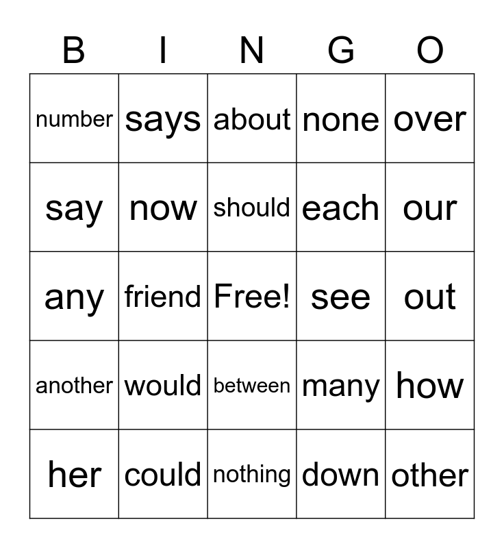 This bingo card has a free space and 24 words: would, could, should, her, over, number, say, says, see, between, each, any, many, how, now, down, out, about, our, friend, other, another, none and nothing.