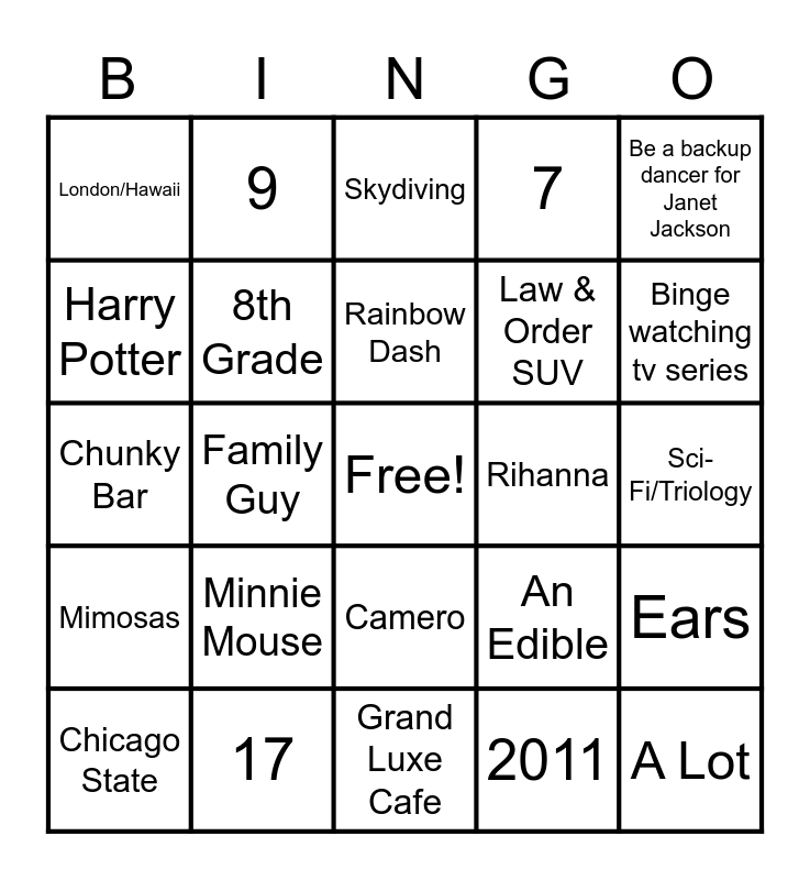 This bingo card has a free space and 24 words: Minnie Mouse, 17, Rainbow Dash, Chicago State, Be a backup dancer for Janet Jackson, London/Hawaii, Harry Potter, 9, Rihanna, Camero, Law & Order SUV, Chunky Bar, An Edible, Ears, 8th Grade, 2011, Sci-Fi/Triology, Skydiving, Binge watching tv series, Family Guy, A Lot, Mimosas, 7 and Grand Luxe Cafe.