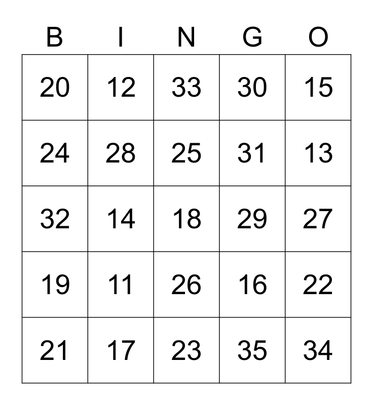 This bingo card has a free space and 24 words: 11, 17, 25, 21, 15, 20, 24, 12, 29, 26, 31, 32, 16, 22, 28, 35, 27, 33, 13, 14, 34, 19, 30 and 23.