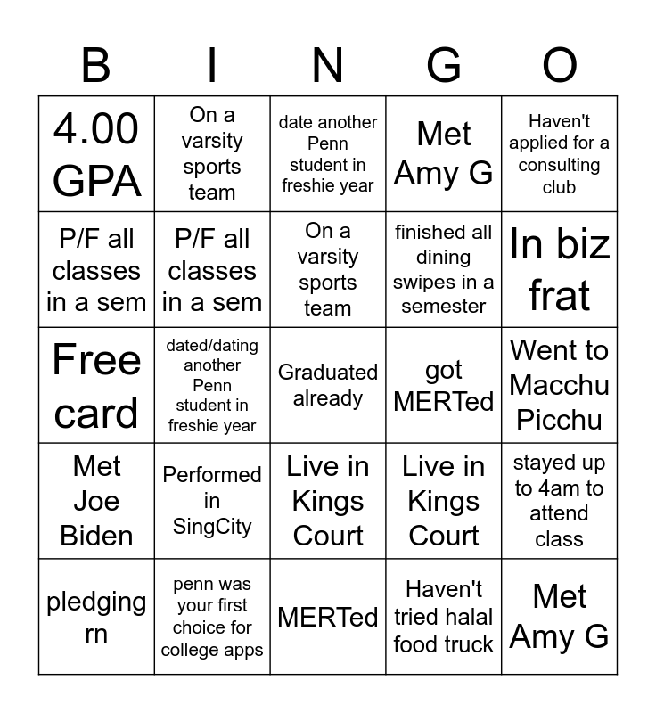 This bingo card has 33 words: Performed in SingCity, Graduated already, Live in Kings Court, Went to Macchu Picchu, In biz frat, 4.00 GPA, dated/dating another Penn student in freshie year, MERTed, Met Amy G, Met Joe Biden, P/F all classes in a sem, On a varsity sports team, LOVES CLUBSG (AKA FREE), Haven't tried halal food truck, Haven't applied for a consulting club, Free card, Performed in SingCity, Graduated already, Live in Kings Court, Went to Macchu Picchu, pledging rn, 4.00 GPA, date another Penn student in freshie year, got MERTed, Met Amy G, Met Joe Biden, P/F all classes in a sem, On a varsity sports team, finished all dining swipes in a semester, stayed up to 4am to attend class, wore shorts in sub-zero temps, penn was your first choice for college apps and transfer to Wharton.