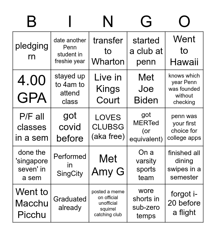 This bingo card has a free space and 24 words: Performed in SingCity, Graduated already, Live in Kings Court, Went to Macchu Picchu, Went to Hawaii, pledging rn, 4.00 GPA, date another Penn student in freshie year, got MERTed (or equivalent), Met Amy G, Met Joe Biden, P/F all classes in a sem, On a varsity sports team, finished all dining swipes in a semester, stayed up to 4am to attend class, wore shorts in sub-zero temps, penn was your first choice for college apps, transfer to Wharton, knows which year Penn was founded without checking, got covid before, forgot i-20 before a flight, done the 'singapore seven' in a sem, started a club at penn and posted a meme on official unofficial squirrel catching club.