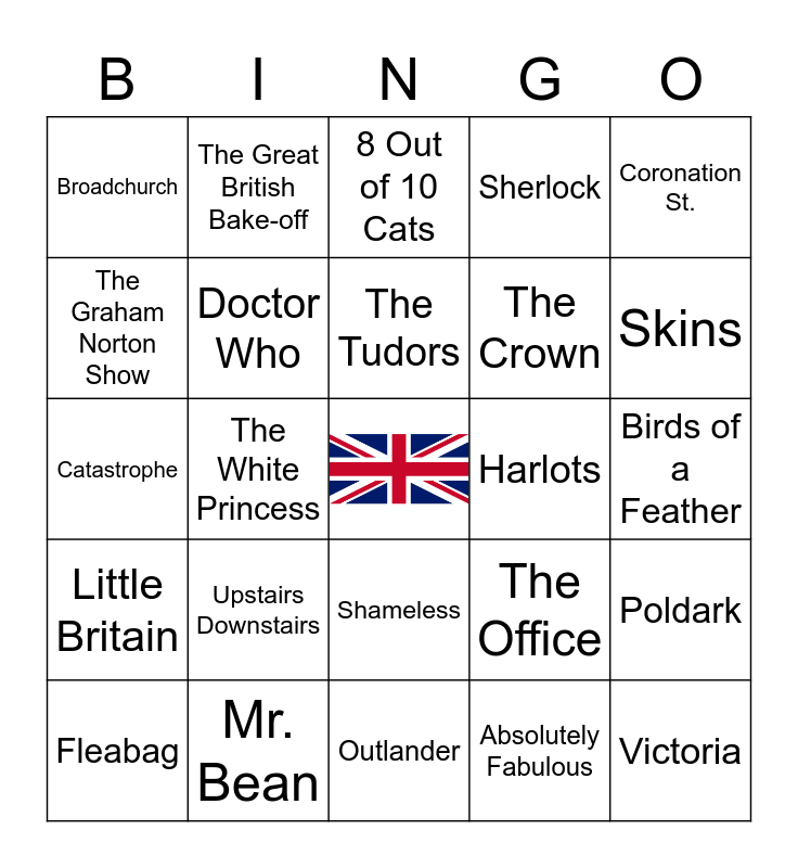 This bingo card has a free space and 49 words: Downton Abbey, Victoria, Belle, Outlander, Upstairs Downstairs, Miranda, The Great British Bake-off, Never Mind the Buzzcocks, The Graham Norton Show, The Last Kingdom, Doctor Who, Sherlock, Poldark, The Office, Bridgerton, The Spanish Princess, The Tudors, Harlots, Call the Midwife, Coronation St., The White Princess, Absolutely Fabulous, Broadchurch, The Crown, Peaky Blinders, Skins, Fleabag, The IT Crowd, Shameless, Little Britain, Only Fools and Horses, Derry Girls, The Inbetweeners, Monty Python's Flying Circus, Mr. Bean, The Vicar of Dibley, Black Adder, Keeping Up Appearances, Birds of a Feather, Countdown, Would I Lie to You?, The Goes Wrong Show, Miss Marple, Agatha Raisin, Catastrophe, 8 Out of 10 Cats, Father Brown, All Creatures Great and Small and EastEnders.