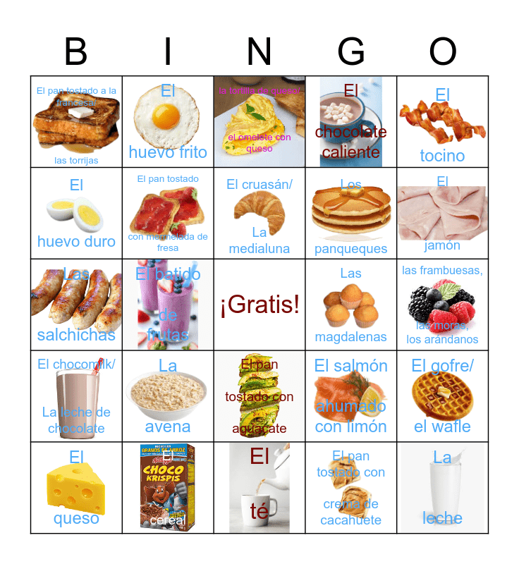 This bingo card has 24 images, a free space and 24 words: La avena, El cereal, El cruasán/ La medialuna, El queso, El tocino, El pan tostado a la francesa/ las torrijas, El huevo duro, El huevo frito, Las magdalenas, El pan tostado con aguacate, Los panqueques, Las salchichas, El salmón ahumado con limón, El gofre/ el wafle, El pan tostado con mermelada de fresa, El pan tostado con crema de cacahuete, las frambuesas, las moras, los arándanos, la tortilla de queso/ el omelete con queso, El jamón, El batido de frutas, La leche, El chocomilk/ La leche de chocolate, El chocolate caliente and El té.