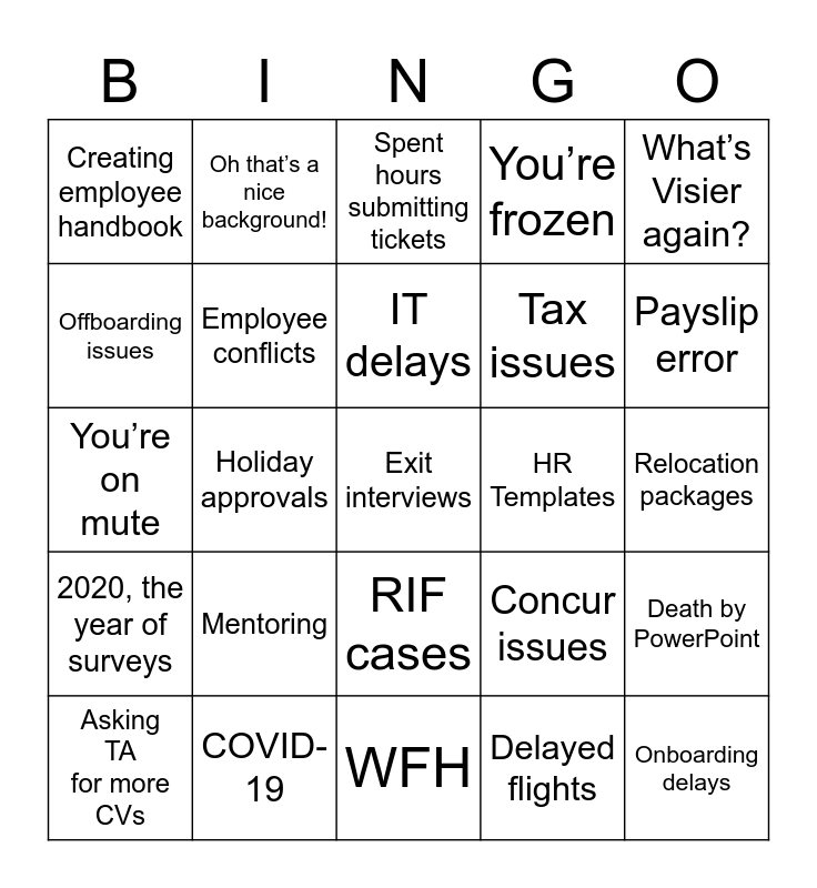 This bingo card has 75 words: Acted as IT support, Complaints about dress code, Spent hours submitting tickets, Monitors >1 email inbox, Payroll error, Process changes, New vendor, Mediating arguments, Tough conversations, Disciplinary action, Onboarding delays, Broken laptops, IT delays, Offboarding issues, SNOW issues, Holiday approvals, LAN ID, Exit interviews, Can’t find the SAP info you need, What’s Visier again?, Sorry, what is Slack?, You’re on mute, Employee conflicts, Oh that’s a nice background!, You’re frozen, Awww you’re children are cute, Is that your dog?, Acted as a admin support, HR customer support, Recruitment delays, Employee wants a promotion, Employee salary/merit increase, Insurance claims, Concur issues, Payslip error, Tax issues, International transfers, Employee visas, Relocation packages, Delayed flights, DE&I requests, BRG meetings, Market medians, Internal medians, C&B data conflicts, Bad first interviews, Asking TA for more CVs, Creating employee handbook, Awkward interview responses, Late to an interview, ‘Emotional’ employees, RIF cases, Simply Excellence awards, SIP rollout, SIP changes, Harassment cases, Security breaches, Integrity/ethics cases, eLearning, Inputting goals, Mentoring, People Managers, Restrux ID, Campus hiring, BTL/ATL, HR Templates, Workforce Planning, NDPT, IDM Team, Death by PowerPoint, 2020, the year of surveys, COVID-19, Sanitsation protocol, WFH and Return to work meeting.